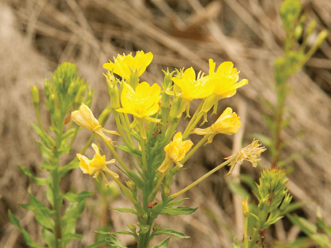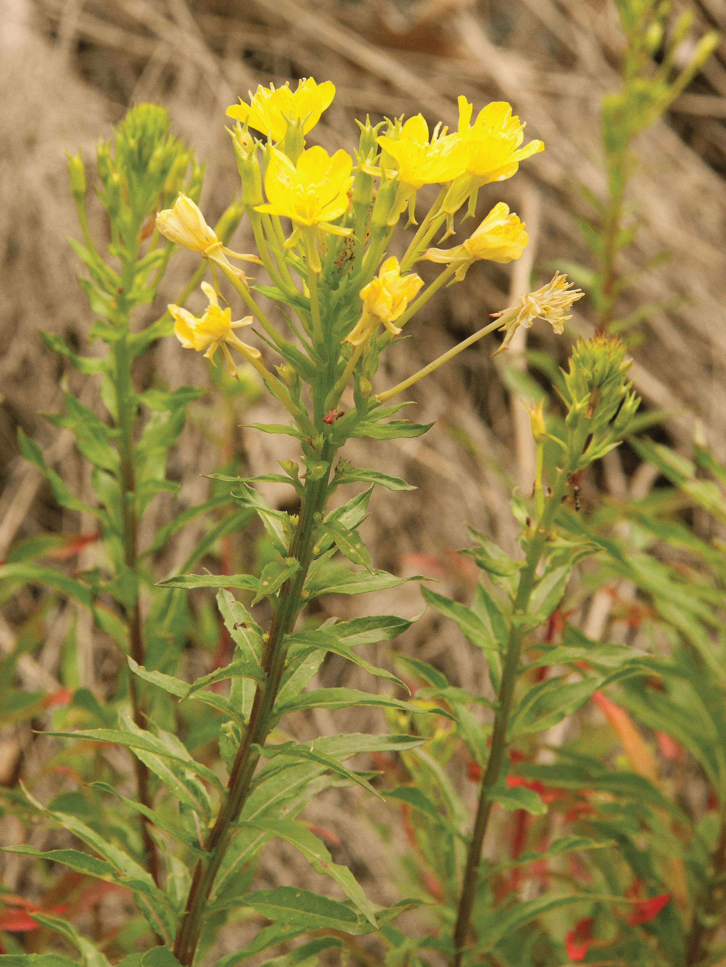 • Plentiful, bright yellow, four-petaled flowers bloom in summer; they open in the evening, hence its common name.