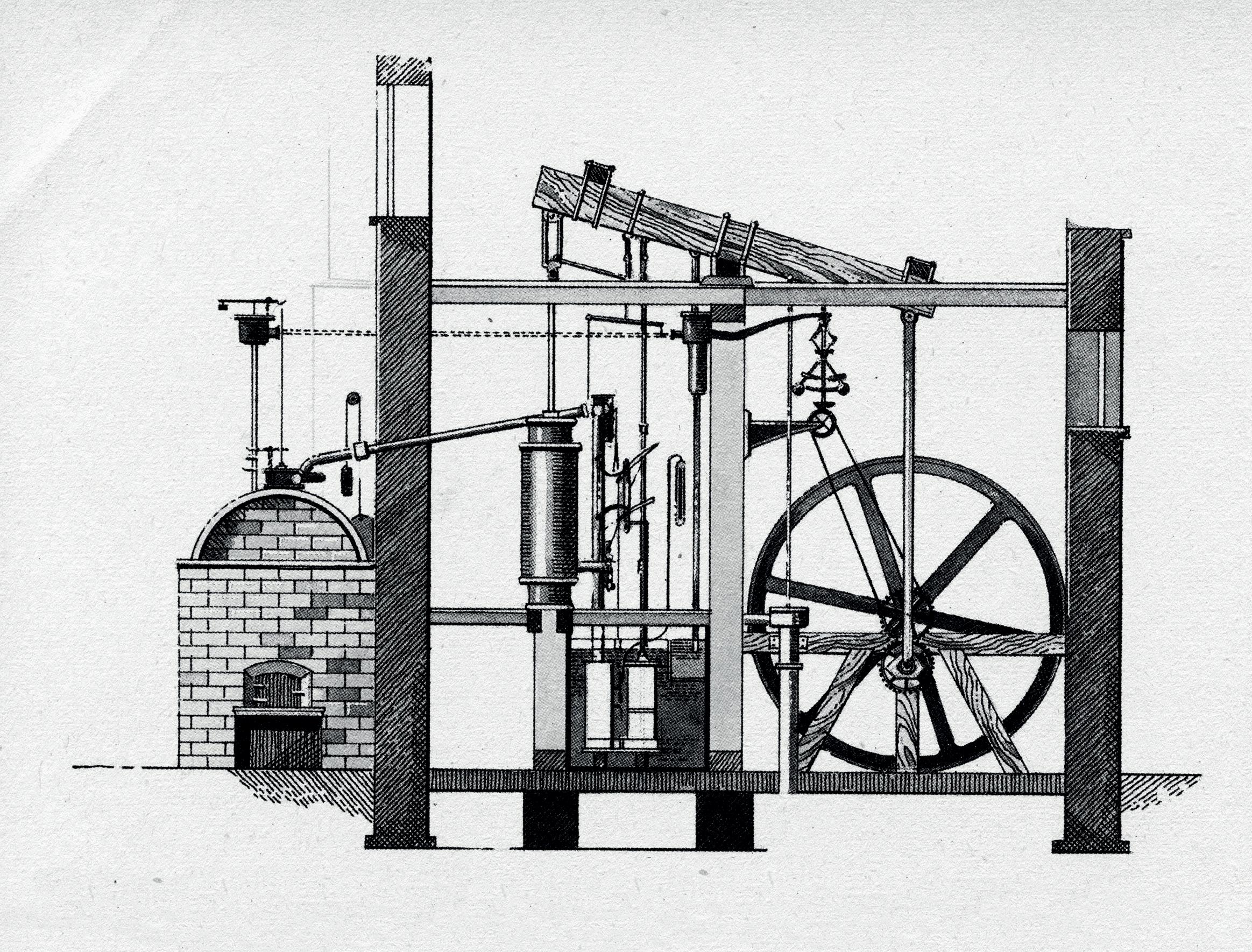 Figura 1.4. Máquina de vapor inventada por James Watt. Fue un invento innovador que cambió la manera en la que la sociedad vivía. Una de sus aplicaciones fue en el transporte; se empleó en locomotoras, barcos de vapor y algunos vehículos que trasladaban las materias primas tanto por tierra como por mar.