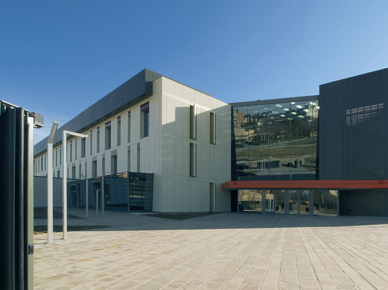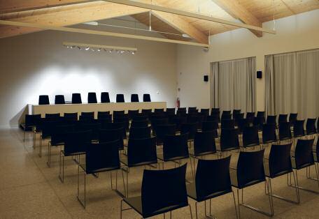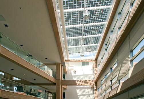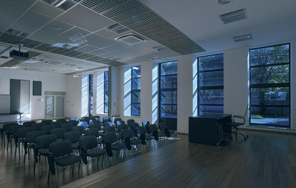 Le grandi aperture vetrate della sala conferenze a sud, 30 m2 di superficie trasparente, suddivise in sei blocchi di serramenti a tutta altezza, sono attrezzate con vetri attivi elettrocromici, in grado di regolare la propria trasparenza luminosa e il proprio fattore solare in base alle condizioni esterne; la commutazione dallo stato chiaro allo scuro, e viceversa, avviene in cinque minuti, grazie all’uso di corrente a basso voltaggio (la trasmissione luminosa passa dal 63% al 2%) Tale tipologia di vetri permette di sfruttare al meglio gli apporti solari nelle stagioni e nei periodi freddi: in estate il caldo rimane all’esterno (fattore solare da 0,47 a 0,06) mentre in inverno si possono sfruttare gli apporti energetici gratuiti, grazie al valore solare variabile da 0,17 a 0,06 mediante sensori installati a bordo finestra, che consentono alle vetrate di autoregolarsi o di essere gestite in autonomia mediante pulsanti installati a parete Oltre a ciò, la migliore luminosità consente di ottimizzare il comfort visivo all’interno, a seconda delle condizioni esterne, senza tuttavia compromettere la trasparenza