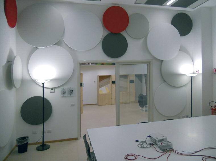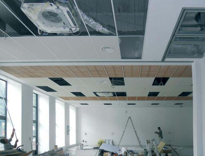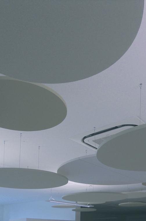In alto, a sinistra, i controsoffitti acustici sospesi nell’area relax Qui sopra, l’area espositiva delle soluzioni edilizie di Saint-Gobain per la sostenibilità
