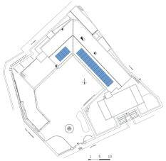 La copertura ospita 3 campi fotovoltaici per una superficie lorda di 160 m2, posizionati in modo ottimale in relazione al rischio di ombreggiamento degli alberi lungo i confini del lotto per massimizzare la produzione di energia elettrica (orientamento d riferimento 30° sud)