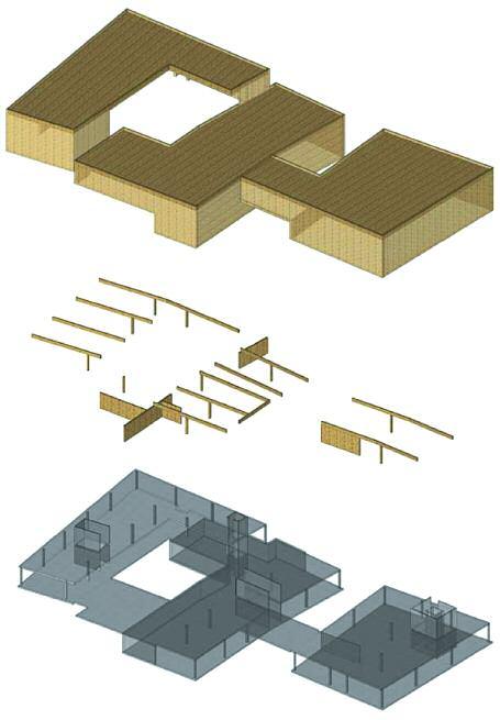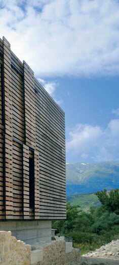 05. Un fabbricato in pietra, reso pericolante dai dissesti strutturali causati dal sisma dell'Aquila del 2009 è stato oggetto di una demolizione e ricostruzione in chiave innovativa ed ecosostenibile Le tracce murarie perimetrali conservate diventano la base di supporto per un edificio scatolare di due piani realizzato in X-lam, dove la coibentazione e le tecnologie a basso impatto ambientale consentono di raggiungere un bilancio CO2 positivo con una prestazione energetica di 6 kWh/m2a (CasaClima Gold in fase di certificazione) Progetto ing Pierluigi Bonomo