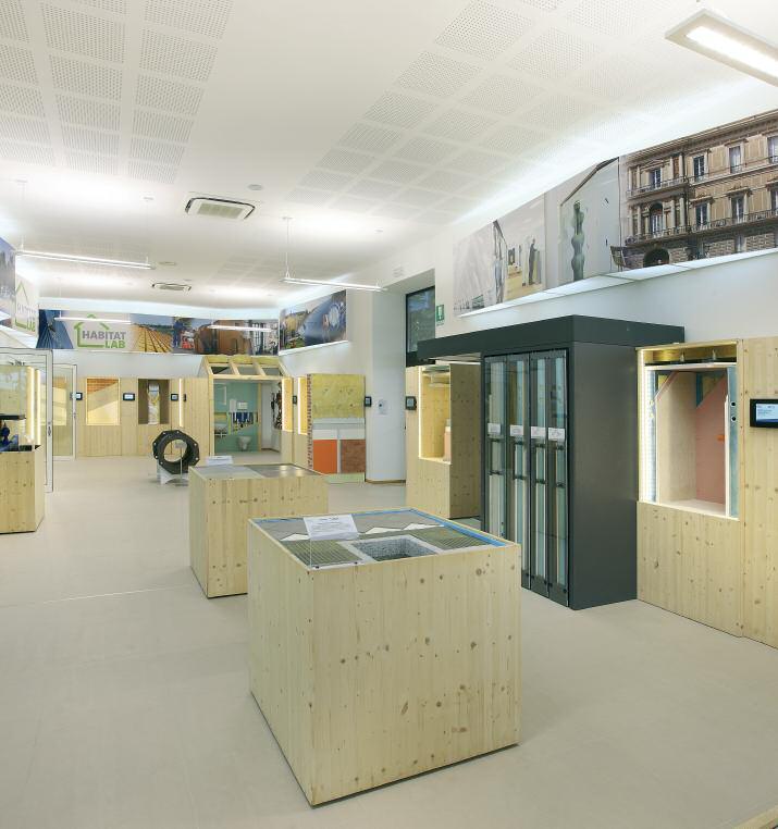 Oltre a essere un Centro formazione, Habitat Lab è anche un laboratorio dove le soluzioni dell’azienda vengono testate in condizioni reali di utilizzo È una “macchina architettonica” controllata da un sistema di rilevamento domotico dotato di 26 sensori: i dati raccolti ogni 5 minuti vengono trasferiti al centro di elaborazione che trasforma le informazioni in grafici, resi visibili a dipendenti e visitatori su schermi ultrapiatti I sensori rilevano in tempo reale le prestazioni in termini di consumi, qualità abitativa degli ambienti, riduzione delle emissioni inquinanti monitorando: consumo energetico, illuminazione, acqua calda sanitaria, fotovoltaico, ricarica vetture elettriche, qualità dell’aria, concentrazione di formaldeide e di CO2, ventilazione Il monitoraggio consente anche di migliorare le prestazioni globali, essendo possibile variare i comportamenti di utilizzo dell’edificio da parte dei fruitori e rilevare la produzione del campo fotovoltaico e i consumi di qualsiasi linea elettrica