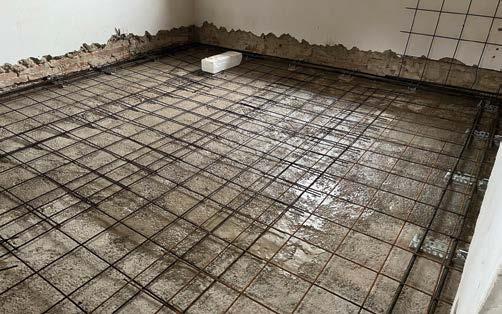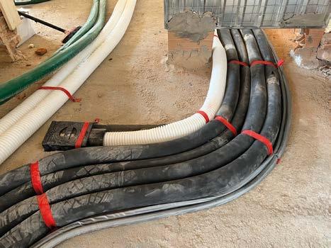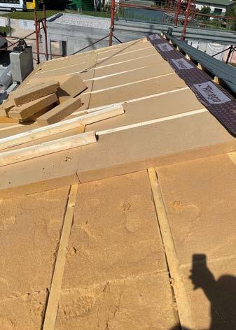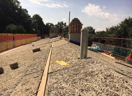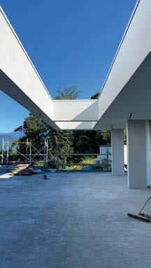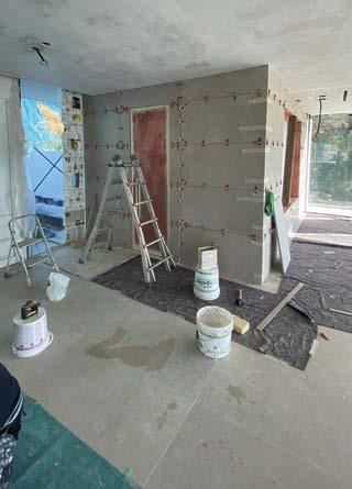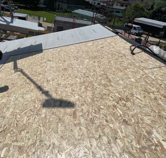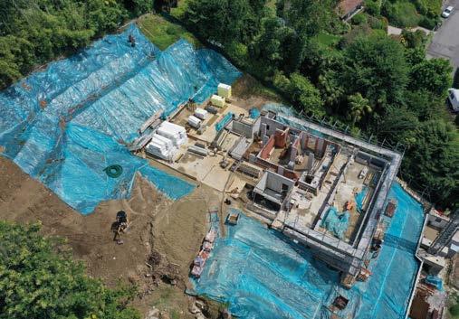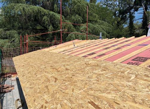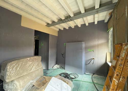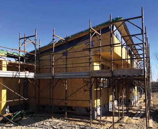In questa pagina dall’alto a sinistra: le strutture della zona notte e dell’area living soprastante; la realizzazione della coibentazione esterna; l’impianto fotovoltaico in copertura; il passaggio impianti; il completamento degli interni con la rasatura delle lavorazioni a secco.
