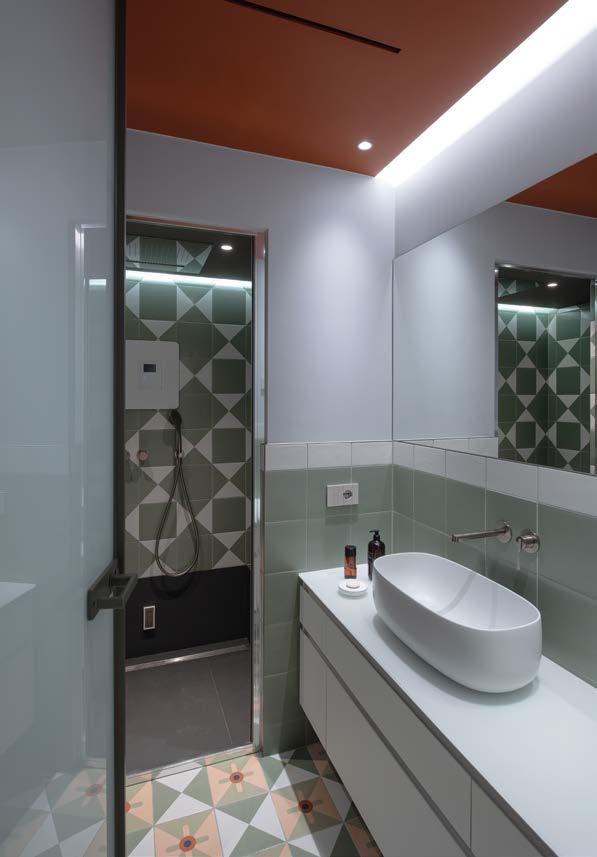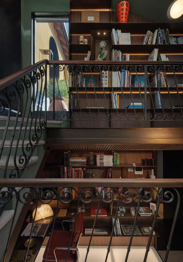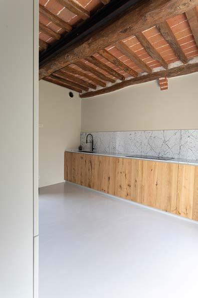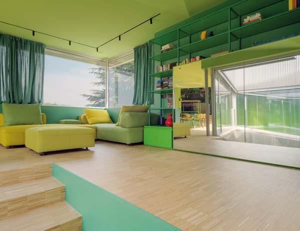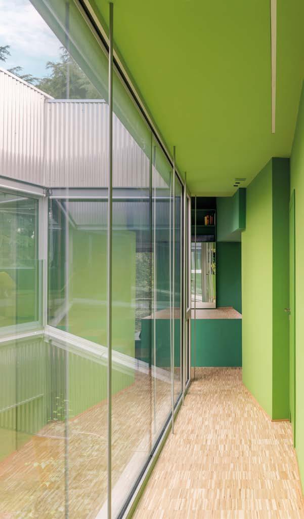 qui il proprietario, chef per passione e professione, domina il resto della casa, entrando in contatto visivo anche con la terrazza e il tetto giardino. Proseguendo ancora intorno alla corte in senso antiorario, si accede a un percorso che porta ad ambienti di servizio e alla zona notte, la quale, distribuendosi lungo il lato ovest della casa, si ricongiunge infine all’ingresso. Le pareti interne della casa sono state colorate in diverse tonalità di verde a suggerire un legame ideale con le fronde degli alberi.