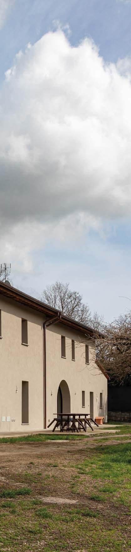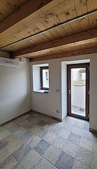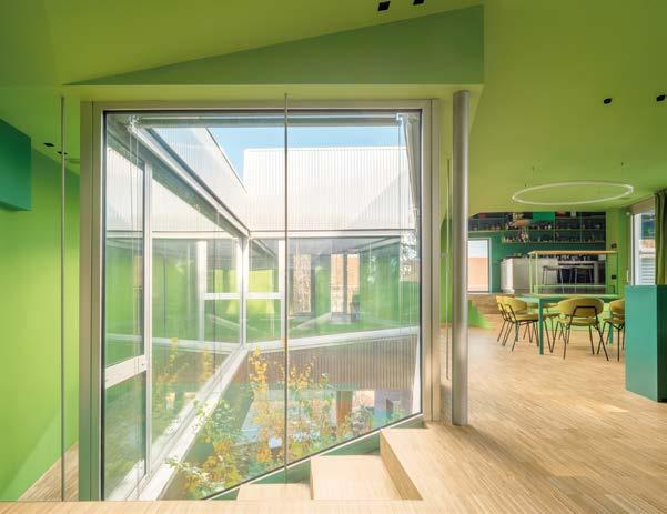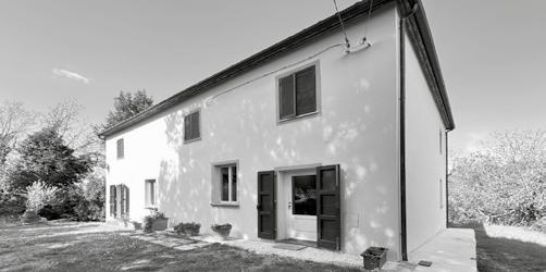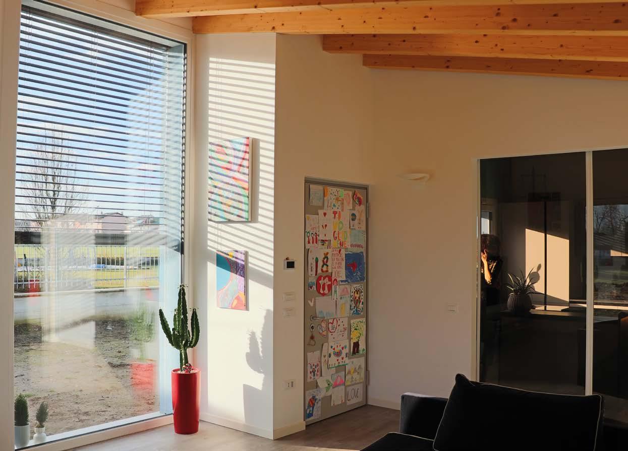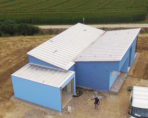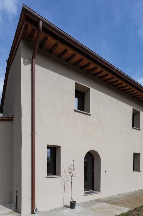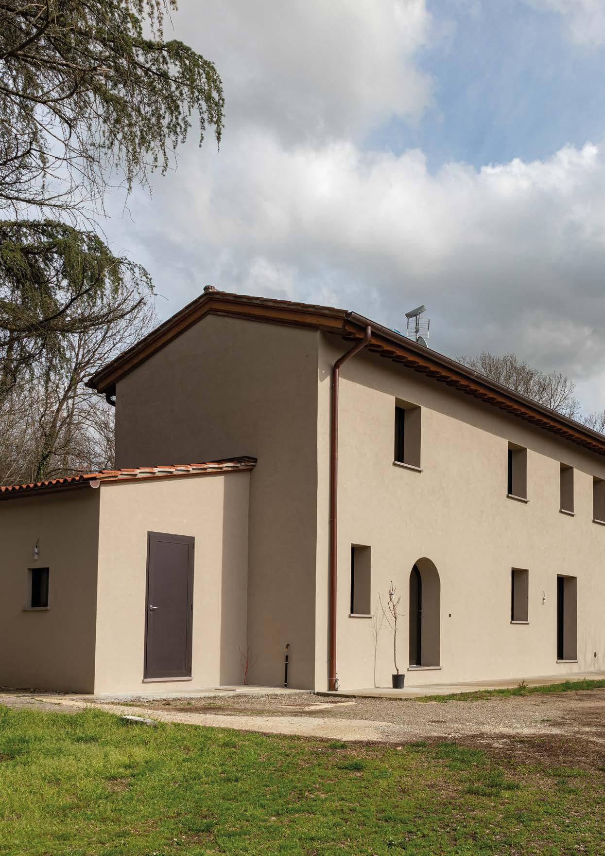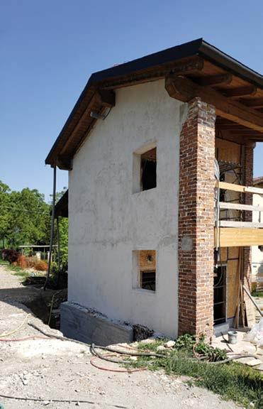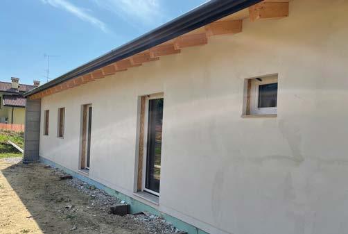 naturali e in piena linea con i principi della bioarchitettura, scegliendo un cappotto in fibra di legno e in silicato di calcio, strutture in legno per i vari orizzontamenti e le pareti esterne, lastre di vetro cellulare (vetro riciclato) per la coibentazione dei solai controterra e intonaci interni ed esterni in calce naturale. Unica eccezione, i serramenti in materiale plastico con finitura “effetto legno”, scelti dalla committenza per una maggiore durata nel tempo e minore manutenzione.