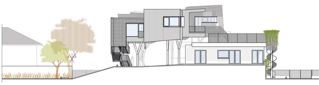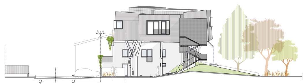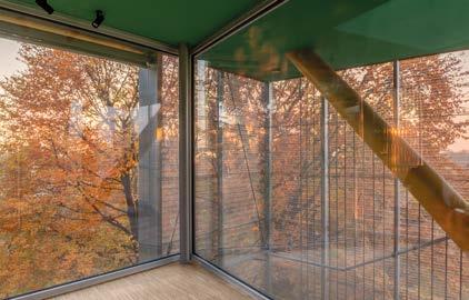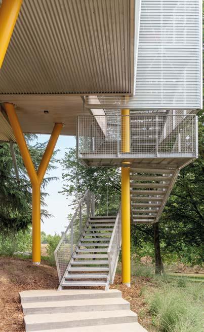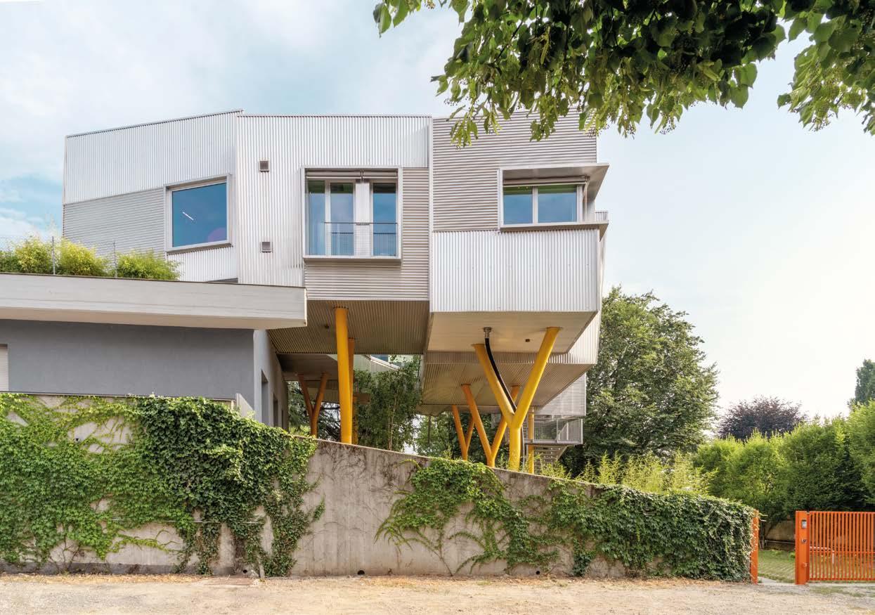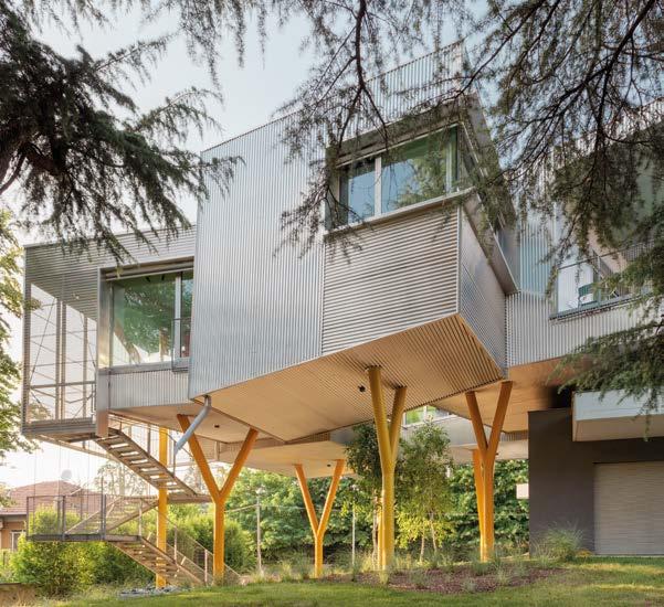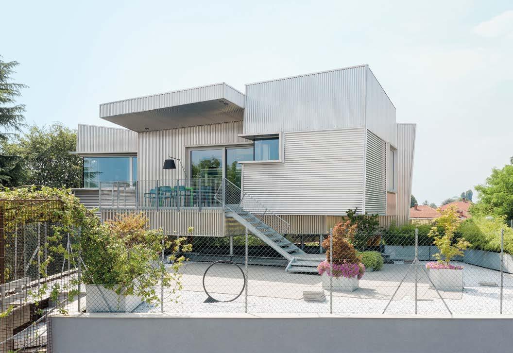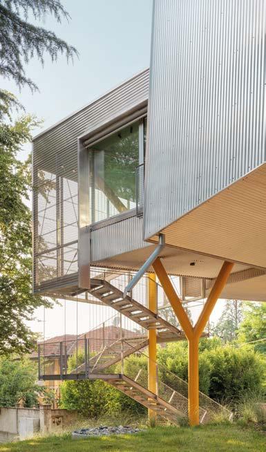 Dal parco la scala esterna permette l’accesso diretto all’abitazione attraverso lo spazio della serra solare, apparendo lieve e leggera, quasi a non voler impattar sul terreno e a mimetizzarsi nel verde, abbarbicandosi attorno a uno dei pilastri a forcella che sostengono l’edificio. Le rampe, appese a pendini metallici, sono protette da una schermatura in lamiera forata di alluminio, che riprende matericamente la finitura in lamiera di alluminio ondulata della casa.