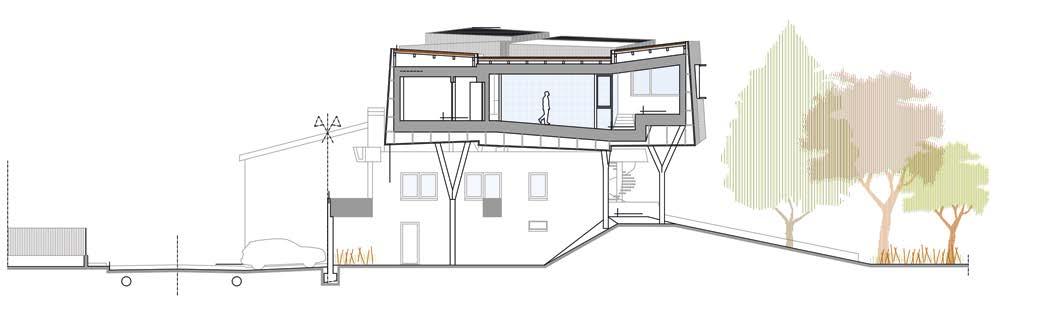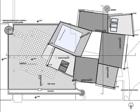 giornate più limpide, si percepisce nella sua maestosità. L’abitazione si spinge verso l’alto, per cercare il cielo e per riportarlo dentro l’architettura stessa, sospesa attraverso l’invenzione della corte vuota, un nucleo inaccessibile ma che, collegando tutti gli ambienti, contribuisce a espandere lo spazio domestico. Un tetto giardino a uso della nuova unità abitativa è stato realizzato demolendo la copertura del fabbricato esistente. La nuova struttura prefabbricata è in acciaio zincato e poggia su alti pilastri metallici a forcella e solo marginalmente sulla struttura di calcestruzzo della casa originaria. Sia i rivestimenti esterni sia le pareti murarie all’interno sono stati costruiti a secco.