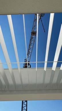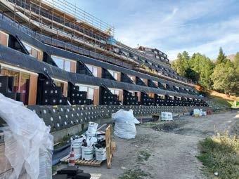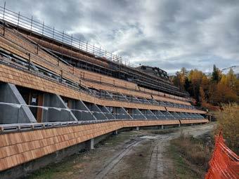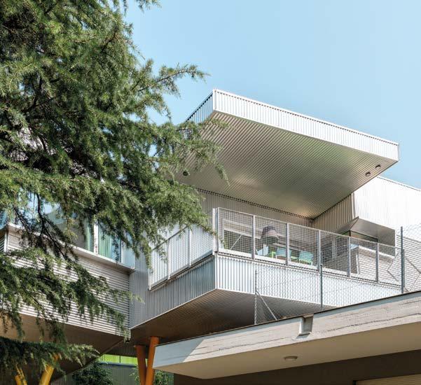 In questa pagina, vista del complesso G1 verso monte. Alla pagina successiva: in alto, particolare della facciata del G1 che evidenzia la costruzione a paraboloide iperbolico; al centro, a sinistra, scorcio del blocco G7, appena completato, in cui si nota il giunto tagliafuoco della facciata ventilata; a destra e sotto, l’affaccio verso il monte del complesso G8 riqualificato.
