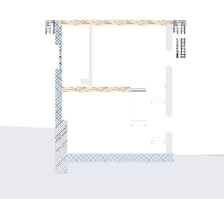 L’ampliamento dell’edificio è stato realizzato mediante una struttura in legno a telaio con interposta fibra di legno (120 mm) e isolamento esterno in pannelli di fibra di legno di spessore 100 mm. Una controparete interna per il passaggio impianti, coibentata in lana di roccia e finita con lastre in cartongesso, chiude il pacchetto dell’involucro opaco.