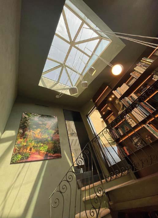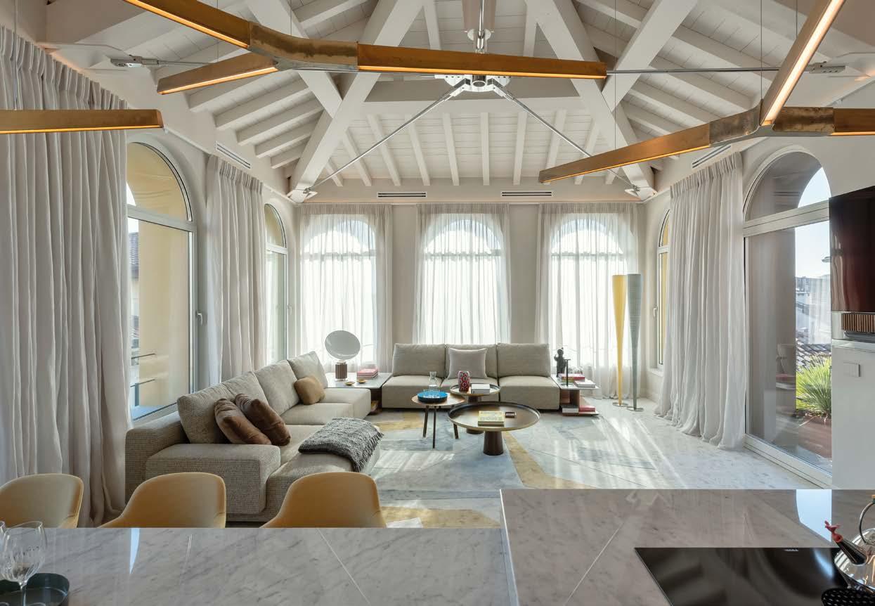 Dallo spazio della serra solare all’ingresso si nota la corte attorno a cui si sviluppa l’impianto planimetrico dell’abitazione e dove tre betulle svettano alla ricerca della luce. Salendo pochi gradini sulla destra si accede al living che si dilata nella sala da pranzo; quest’ultima è direttamente collegata alla terrazza dalla quale si può scendere sul tetto giardino ricavato sulla copertura dell’edificio preesistente. Dalla sala da pranzo, con pochi gradini, si raggiunge la cucina, sita in una posizione ad angolo ed esposta a nord-est. Da