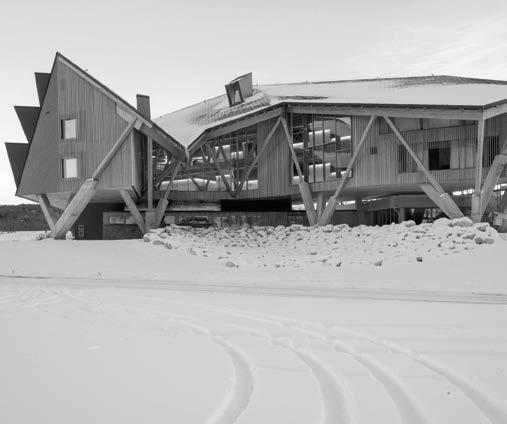 Nella pagina accanto, la struttura in legno dell’ampliamento, il cappotto in fibra di legno sulle pareti in legno e l’edificio dopo la riqualificazione.