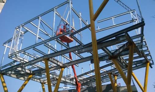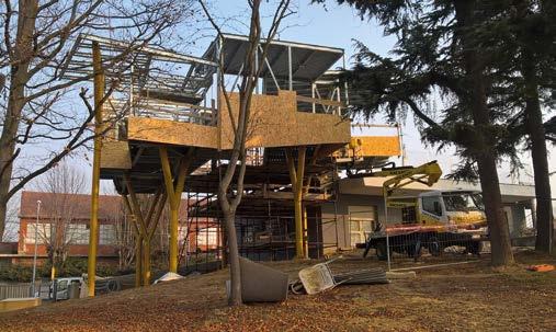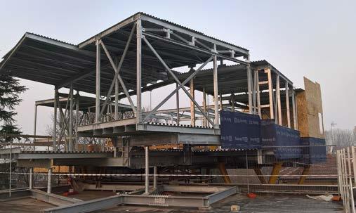 Immagini del montaggio della struttura dell’ampliamento: dalla posa dei pilastri a forcella sino alla realizzazione dell’ossatura metallica della nuova casa.