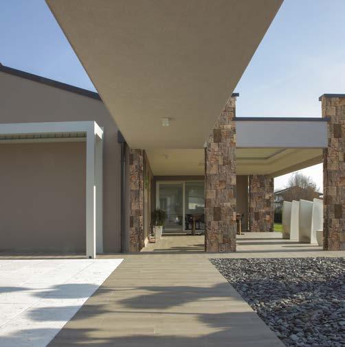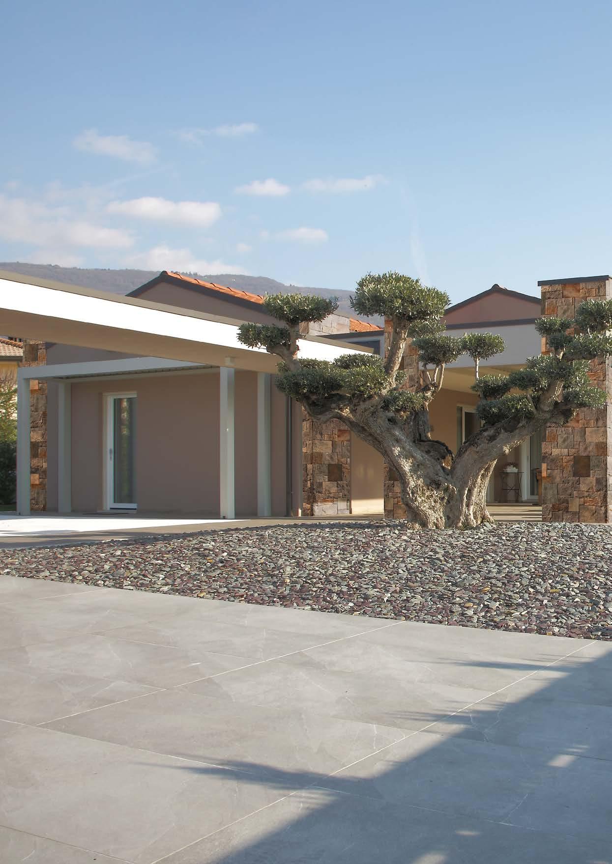 Gran parte della casa – tutto il piano notte e alcuni volumi della zona giorno, sia esternamente sia all’interno, murature in elevazione e pavimentazioni – è rivestita con elementi ceramici. Il rivestimento in lastre di grès, posate in parte su piedini a realizzare un pavimento flottante e in parte mediante incollaggio, ha richiesto una progettazione esecutiva e una lavorazione in cantiere estremamente precise, al fine di raggiungere la continuità visiva tra fuori e dentro e la corrispondenza dimensionale, ove possibile, con le aperture vetrate. Ogni elemento della costruzione, infatti, è stato basato sul modulo del rivestimento.