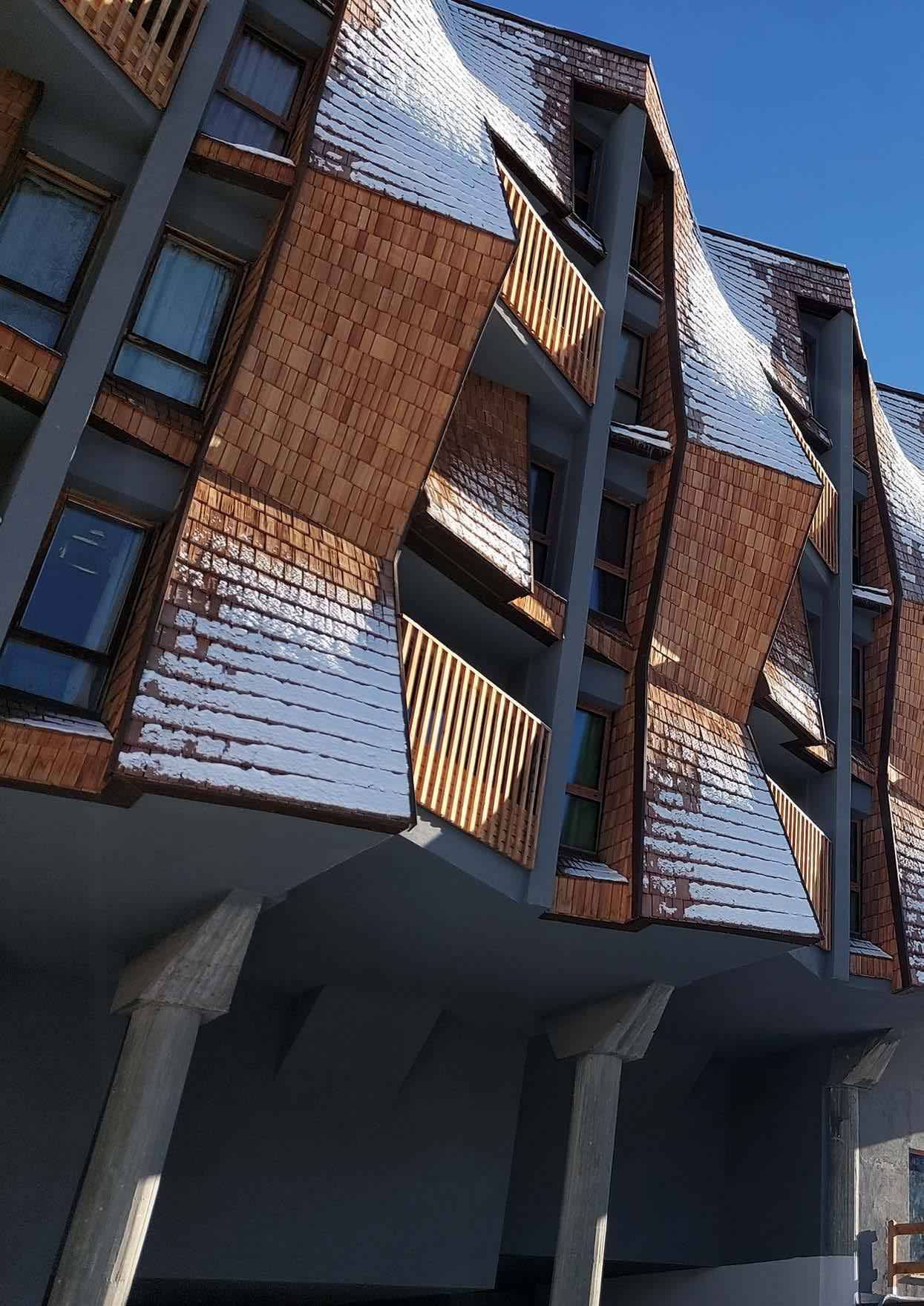 Iniziamo a conoscere questo progetto con una breve premessa storica che ci consentirà di dettagliare meglio tutti gli interventi di riqualificazione effettuati su questo rilevante polo turistico. Nel 1972, con progetto generale dell’arch. Laurent Chappis approvato dalla Regione Autonoma Valle d’Aosta, inizia lo sviluppo del complesso Grand Gorraz che è, ancor oggi, costituito da sette edifici residenziali e da una struttura alberghiera e che si estende linearmente lungo un pendio nella conca di Pila, con la strada e i parcheggi al proprio interno. Gran parte dei fabbricati sono integrati all’interno del profilo del terreno e le sezioni emergenti non superano i 12 m; in ogni porzione edilizia, due o tre blocchi scala servono unità abitative di diversa superficie – monolocali, alloggi duplex bilocali e trilocali – con zone giorno e notte poste a livelli differenti e affacciate sul paesaggio grazie a un piccolo terrazzo privato. La struttura portante degli edifici è in c.a. con elementi modulari e con solai a nervature incrociate a orditura triangolare per le grandi luci. Le superfici in c.a. sono lasciate a vista e il rivestimento esterno in scandole di legno è un rimando tattile ai circostanti boschi di conifere.