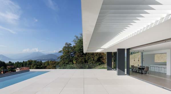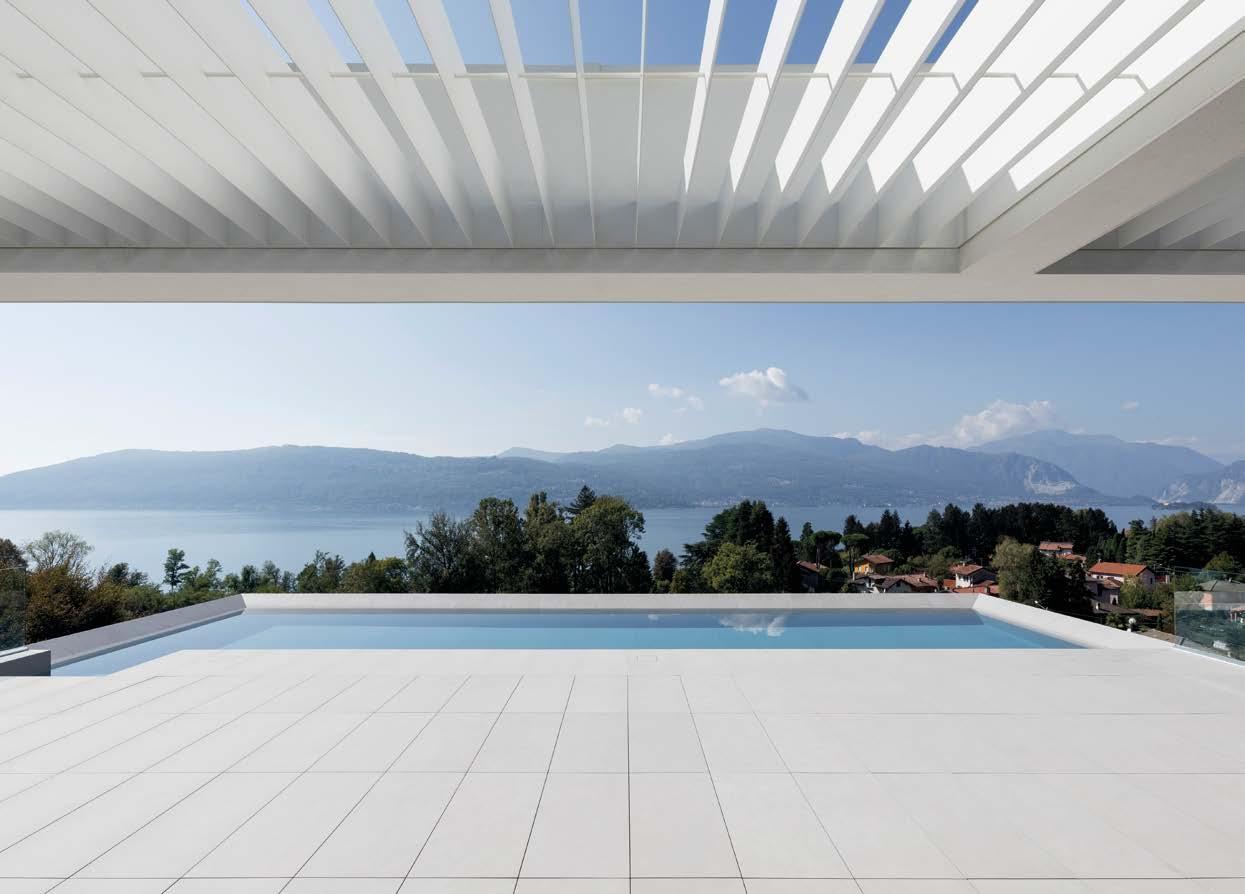 Vista dalla zona giorno sulla piscina e sul lago con il belvedere rivestito di grès.