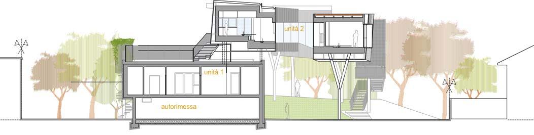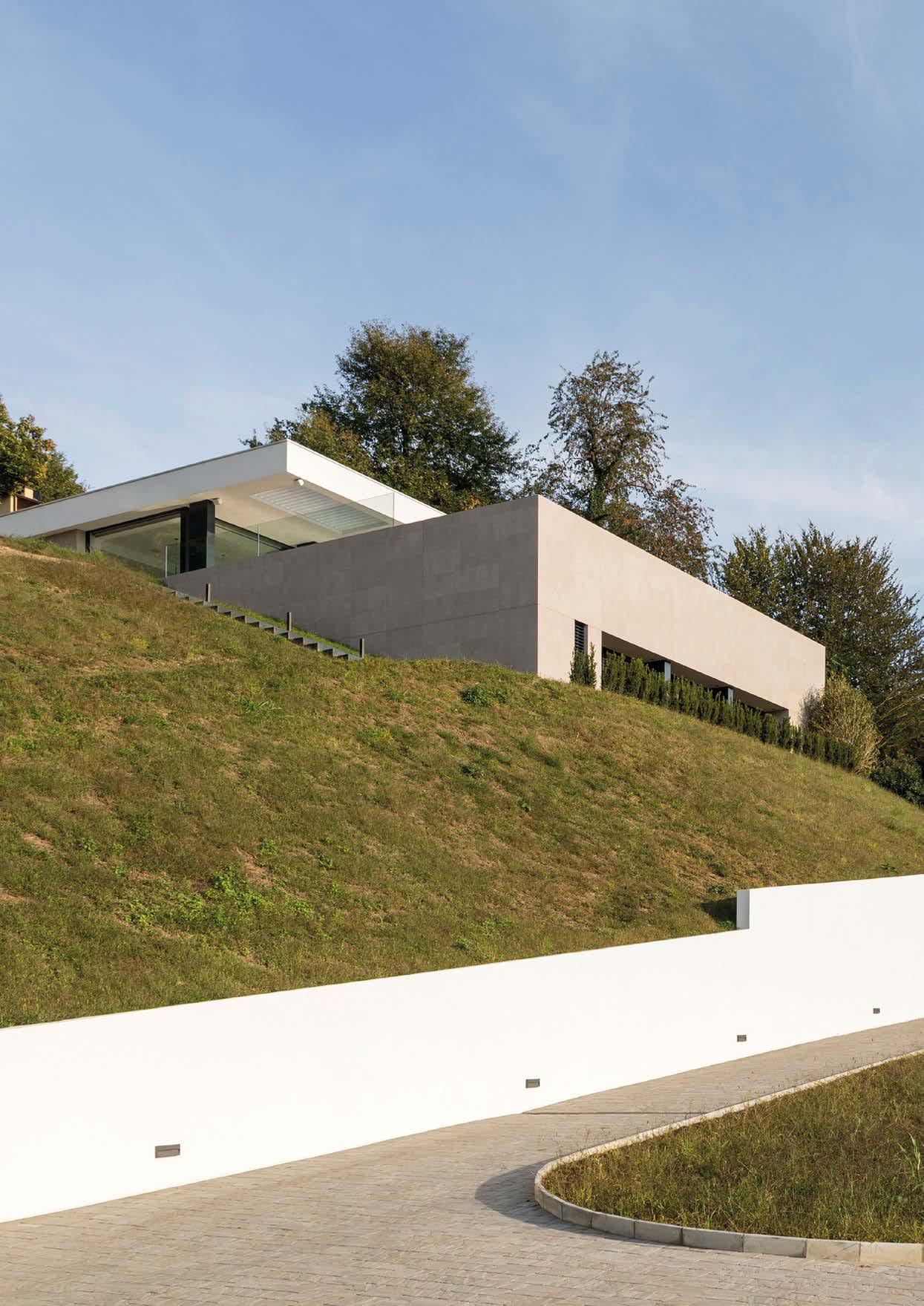 Su un versante collinare rivolto a ovest verso le sponde del Lago Maggiore e verso la catena alpina, una nuova abitazione si adagia su una proprietà caratterizzata da un forte dislivello terrazzato, dove a monte si incontra il limitare di un’area boschiva, mentre a valle si distende l’intorno di un tessuto residenziale diffuso. La forma della casa è la sintesi delle molte professionalità coinvolte in questo progetto, in cui i desideri del committente, le possibilità normative, l’impegno dei progettisti nel restituire al paesaggio un edificio di qualità hanno concretizzato il programma dettagliato che richiedeva un soggiorno di grandi dimensioni, un belvedere, cinque camere e la piscina. Nonostante il terreno fosse piuttosto ampio, la collocazione della casa sul lotto è stata quasi obbligata, poiché la fascia edificabile era in realtà una porzione relativamente piccola, e la forte pendenza del terreno ha portato a slittare verso monte il volume della zona giorno generando, con questo semplice movimento, lo spazio necessario a formare il belvedere e la piscina. Quest’ultima sfrutta a sua volta la pendenza esistente in modo da essere