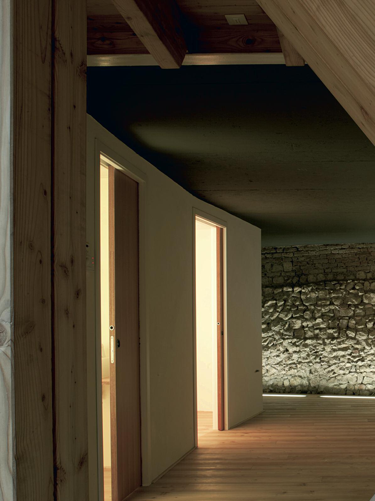 Da sinistra: le pareti interne ancora al grezzo, fortemente caratterizzate per la loro struttura e la posa di un solaio