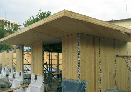 Da sinistra: parete con striscia dentellata fonoisolante; solaio in pannelli portanti con bordo sagomato e la striscia dentellata fonoisolante; pareti interne portanti sagomate per accogliere gli arcarecci del solaio