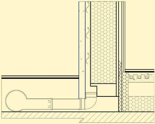 Sulla destra del disegno si può notare il particolare del nodo di attacco tra la parete esterna a telaio e la struttura della tettoia esterna La parete esterna presenta uno strato di isolante in fibra di legno sul lato interno, nell’intercapedine tra i montanti del telaio e sul lato esterno La fibra di legno utlilizzata per la coibentazione della parete ha densità diverse a seconda della necessità Per la coibentazione della copertura è utilizzato uno doppio strato di EPS, di cui quello più esterno è sagomato in pendenza per favorire il deflusso delle acque meteoriche