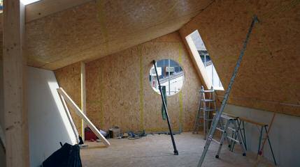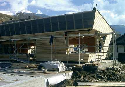 La parete è isolata sia internamente che esternamente con fibra di legno di diversa densità; l’isolamento esterno è posato senza soluzione di continuità fino alla sommità della veletta di copertura