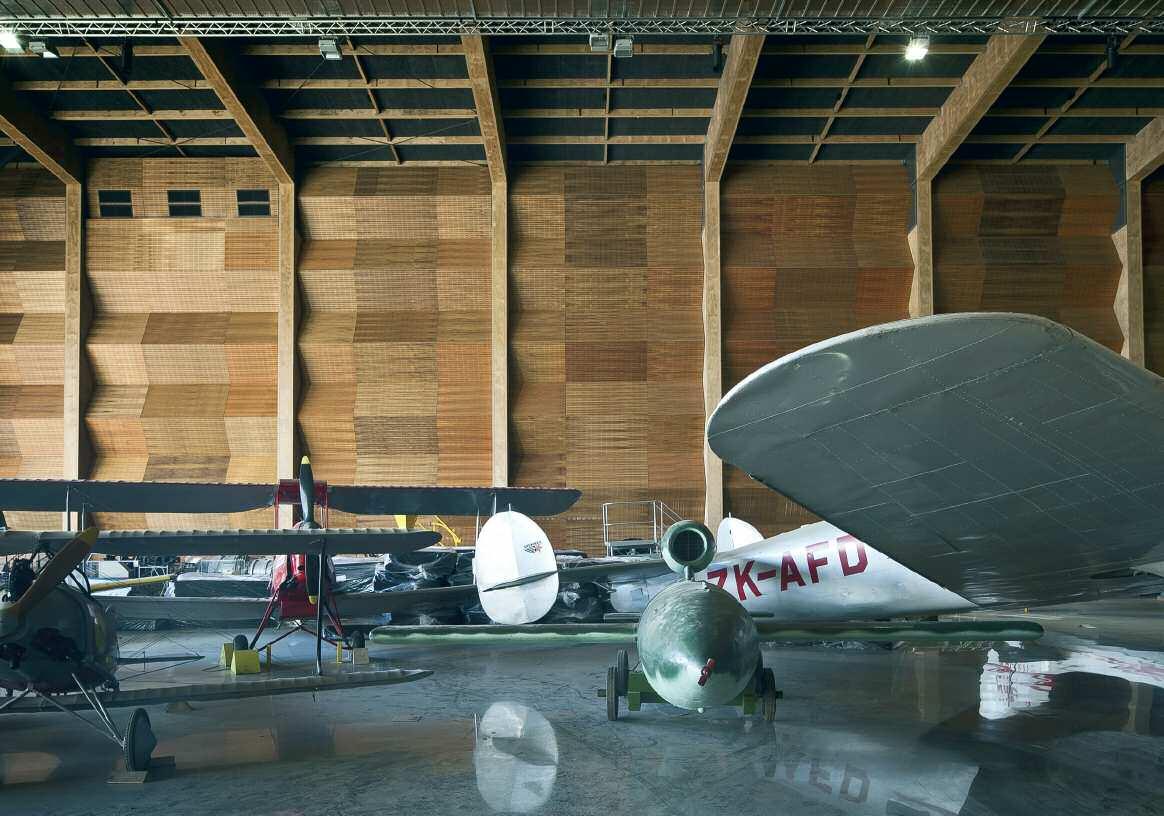 Abbastanza stranamente, gli hangar con i reticoli strutturali in calcestruzzo di Nervi sono stati una vera ispirazione dal punto di vista progettuale, ma abbiamo imparato che queste soluzioni non possono essere facilmente ed economicamente replicate con il legno o altro materiale Tuttavia, ritornando al legno e ai portali intelaiati a forma di “appendino” (hanger form), un po’ della nostra ispirazione è venuta anche dagli aerei con con il guscio a reticolo in struttura lignea della Seconda Guerra Mondiale, ospitati nella collezione del MOTAT Anche l’officina del 1942 del Blister Hangar limitrofa all’Aviation Display Hall, con una volta lignea a botte fatta di piccole sezioni di legno imbullonate, un primitivo precedente dell’LVL, è stata fonte di ispirazione per il nuovo edificio Abbiamo reinterpretato l’attuale forma del tradizionale portale ad appendino, creando la struttura e la pelle dell’edificio dal legno