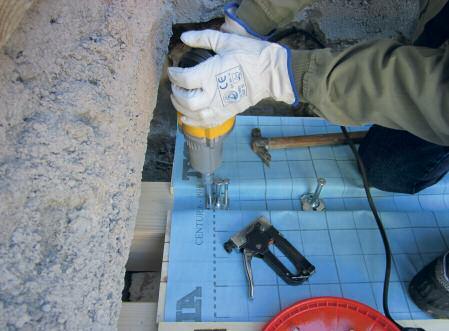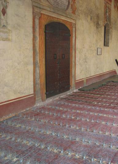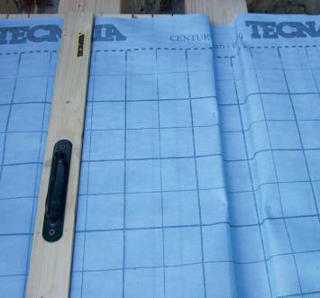 Al fine di evitare l’assorbimento dell’acqua di impasto da parte del tavolato si è scelto di posare il telo Centuria®. Questo telo, studiato appositamente per questo genere di applicazioni, ha la caratteristica di essere impermeabile nella superficie superiore, ma traspirante nella superficie inferiore In questo modo, se ci dovesse essere elevata umidità negli ambienti sotto al solaio, questa non condenserà sulla faccia inferiore del telo