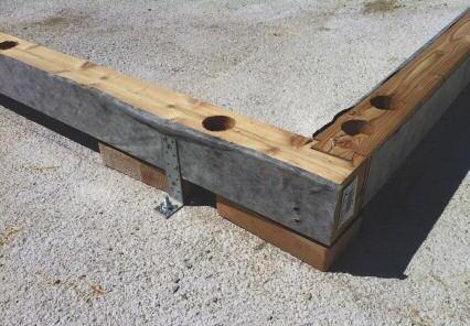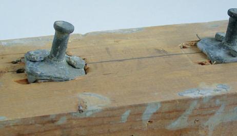 Test su Connettore Base. Questo è uno dei numerosi campioni in legno sui quali sono stati posati due connettori e una soletta in calcestruzzo. Tali campioni sono stati sottoposti a una forza trasversale ed è stata misurata resistenza e scorrimento relativo Nel campione, a fine prova, è stato rimosso il calcestruzzo per vedere l’efficacia dei ramponi