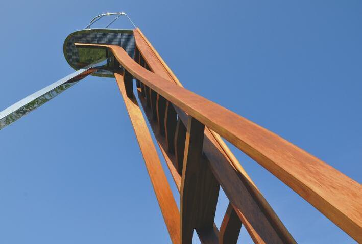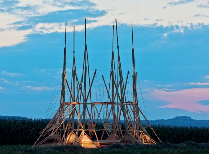 Questa piattaforma panoramica è realizzata in legno di sequoia e acciaio, materiali che creano una dualità percettiva: a scala territoriale sembra piccola, fragile e delicata – all’interno del contesto – ma grande e robusta a livello dell’osservatore