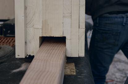 Trave principale di solaio a doppia orditura in fase di lavorazione Si notano i connettori posti in doppia fila e la siglillatura di fessure tra la trave e le tavole di contenimento del getto