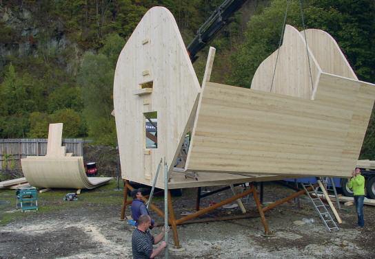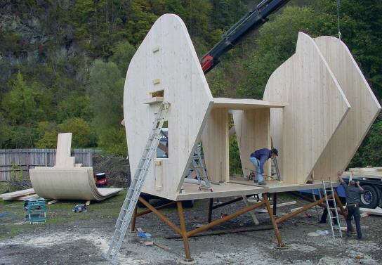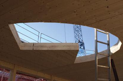 meccanizzati di lavorazione, cosicché si può spaziare dal legno di grandi dimensioni ai pannelli particellari fino alla polpa di cellulosa Come studio, siamo sempre in cerca di modi diversi di considerare il legno come materiale da costruzione In un progetto attualmente in costruzione stiamo usando il legno nella sua forma più sottile, un impiallacciato flessibile che è realizzato come se fosse una lamiera stirata