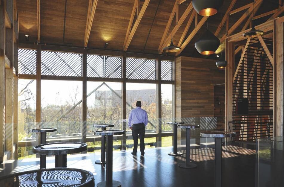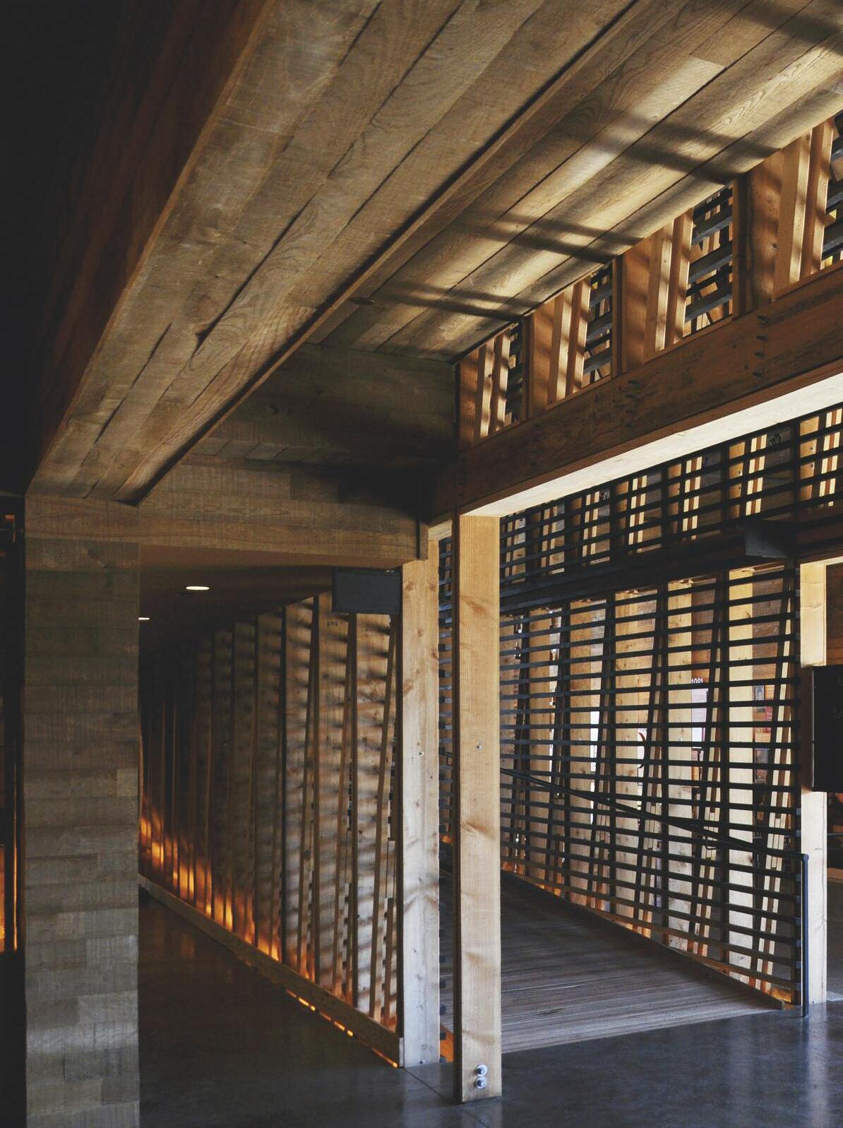 Nel progetto che pubblichiamo su questo numero, il Wild Turkey Visitor Center, il legno è utilizzato come rivestimento esterno, semplice e scuro, che tuttavia nasconde una struttura lignea interna, molto complessa e articolata, a suddividere spazi e funzioni interne Quale è stata la vostra ispirazione per questo differente utilizzo del legno, semplice all’esterno e complesso all’interno?