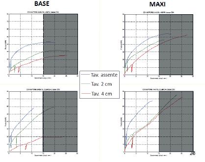 Risultati delle prove. Grafici caricospostamento dei connettori posati direttamente su trave, su tavolato da 2 cm di spessore o su tavolato da 4 cm di spessore