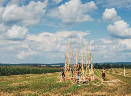 Questo è interessante perché originariamente non avevamo intenzione di utilizzare il bambù, ma avevamo bisogno per l’edificio di una pelle porosa che permettesse alle brezze di fluire attraverso consentendo al fieno conservato di asciugarsi Esiste una “canna del Kentucky” che cresce spontaneamente nella nostra regione, un bambù dallo stelo molto sottile che è abbastanza invasivo, quasi un’erbaccia Abbiamo notato che, con un interessante parallelo con il fieno che è asciugato e conservato all’interno dell’edificio, entrambi (fieno e bambù) sono tipi di erbe
