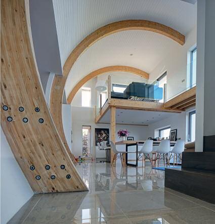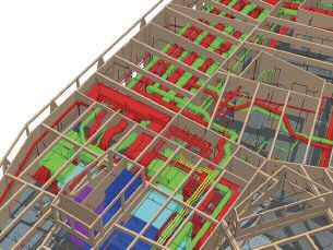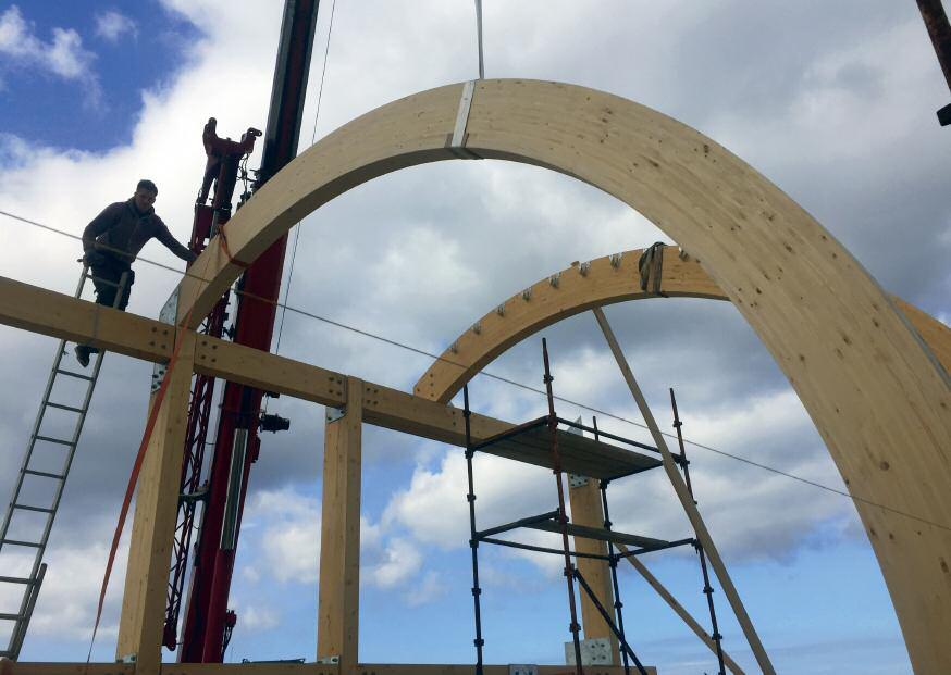 In questa immagine e in quelle della pagina a fianco, i pilastri in legno lamellare diventano travi di copertura, senza soluzione di continuità; ogni elemento curvo è unico.