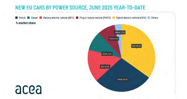 veicoli con motore termico: le auto a benzina scendono al 28,4% del mercato, in calo dal 35,4% dell’anno precedente, con un crollo delle immatricolazioni del 21,2%. Ancora più marcata la flessione del diesel, che cala del 28,1% e scende al 9,4% del mercato. In termini geografici, i maggiori mercati per le auto elettriche BEV hanno registrato risultati misti: in Germania le vendite sono aumentate del 35,1%, in Belgio del 19,5% e nei Paesi Bassi del 6,1%, mentre la Francia ha segnato un calo del 6,4%. Anche le vendite mensili di giugno confermano il trend: +7,8% per le auto elettriche, +6,1% per le ibride, e un impressionante +41,6% per le ibride plugin. Al contrario, le auto a benzina e diesel hanno subito rispettivamente una flessione del 25,4% e del 34,1%. Nel complesso questi dati indicano che, nonostante il calo complessivo delle immatricolazioni, la transizione verso forme di mobilità più sostenibili prosegue, seppur a ritmi ancora troppo lenti rispetto agli obiettivi ambientali dell’Unione Europea. u