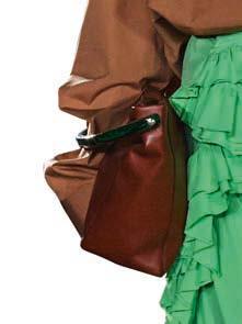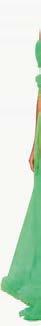 Satijnen hemd, Charlotte Baude. Halterjurk met drapage naar armband, Studio Soir. Groene oversized blazer, MM6 Maison Margiela. Fluogroene laklederen ‘Nini’-sandaal op hak, Morobé.