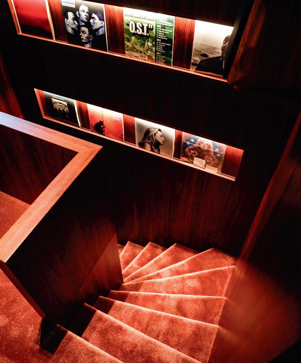 Joy Division, Kraftwerk… Caroline et Stéphane y travaillent côte à côte, autour d’un grand bureau. « Nous aimons être ensemble tout en travaillant chacun de notre côté. Les trois enfants de Stéphane passent souvent avec leurs amis. La forme ronde de la pièce la rend très conviviale, et comme l’extension est légèrement en contrebas, nous sommes en contact direct avec la nature. Nous sommes à la hauteur de l’herbe. Parfois, des cerfs s’approchent de la fenêtre, ne nous remarquant que lorsque nous bougeons nos chaises. C’est vraiment magique. » Jamais de disputes dans cet espace si serein ? « Stéphane a bien plus de sagesse que moi, ça vient avec l’âge (rires). J’apprécie sa vision, mais quand il me donne des conseils sur mon travail, je peux devenir un peu piquante. C’est mon domaine ! » Quant à l’aménagement de la pièce, ils sont rapidement tombés d’accord. Stéphane a opté pour le bois de palissandre chaleureux, tandis que Caroline a choisi le canapé rose et le tapis assorti pour une touche audacieuse. Même dans la cave sous le bureau, les choses sont bien réparties : elle y a une salle de sport et un sauna, tandis que Stéphane dispose d’un mur entier de casiers à vin.