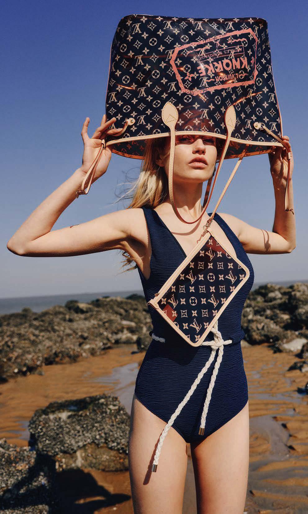 veau naturel, Louis Vuitton. Maillot de bain une pièce avec ceinture en corde, Louis Vuitton.