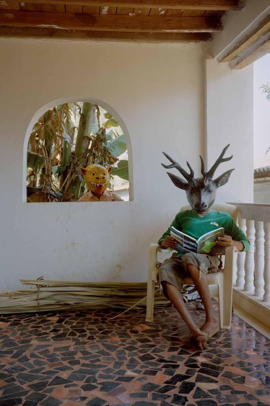 Acts of Appearance assumed its form within a village of Adivasi papier-mâché artists from the Kokna and Warli tribes in Palghar district. Further inland from Dahanu, it is one of the most impoverished districts in Maharashtra, India. Gill’s collaborator-subjects are renowned for their papier-mâché objects, including traditional sacred masks made for the yearly Bohada procession. In these pictures the artists as well as other local volunteers engage in everyday village activities while wearing new masks, made by them expressly for this body of work beginning in 2014. The new creations depict living beings with the physical characteristics of ordinary humans, commonplace animals, or valued objects. A range of scenarios and narratives, situated in both “reality” and dreamlike states, come together in the photographs, which simultaneously portray symbolic or playful representations as well as the familiar experiences of community members against the backdrop of their home and culture.