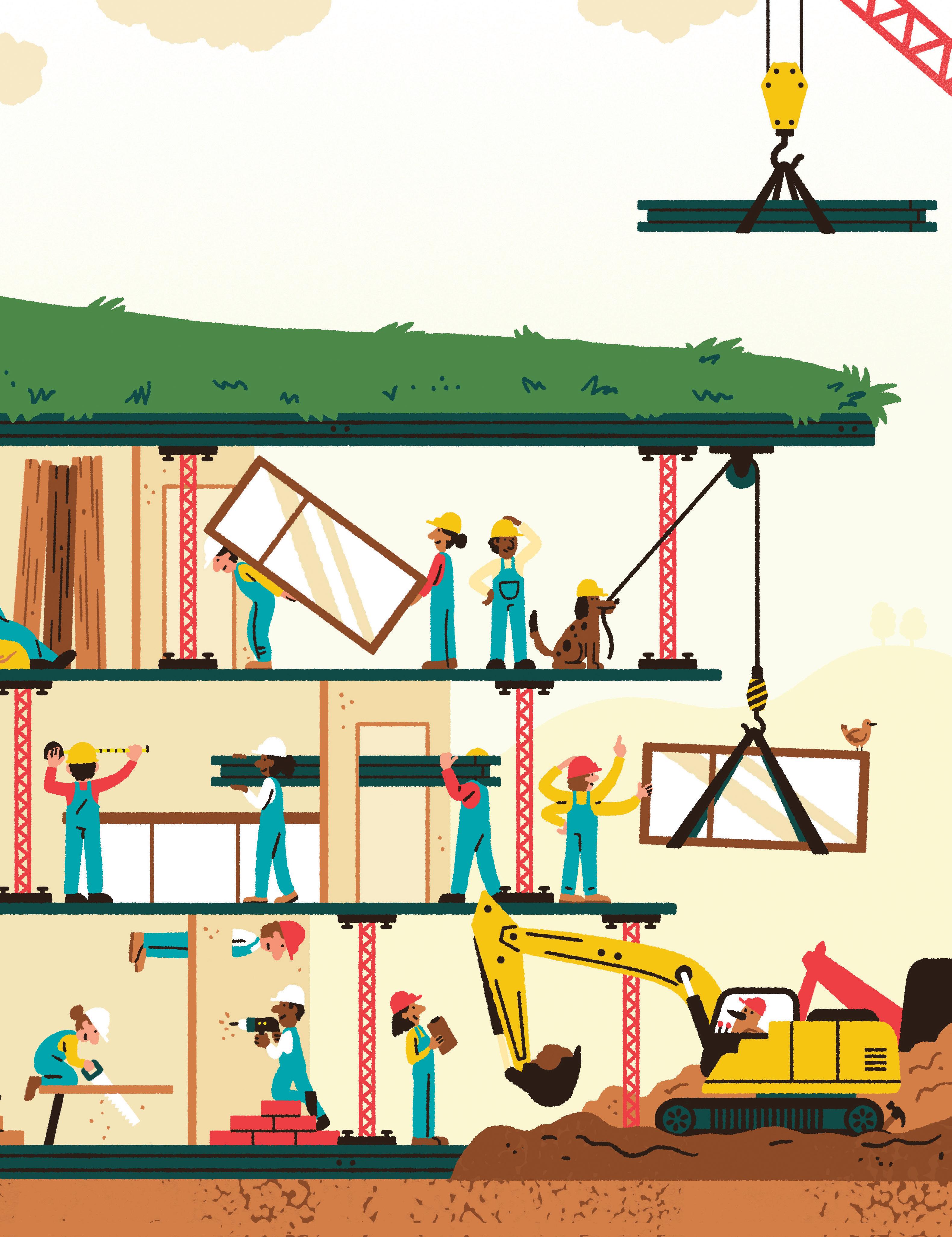 Faire le tour du monde des maisons, visiter un étrange chantier, imaginer un toit végétalisé, dessiner des pyramides à main levée, trouver 12 différences dans l’atelier d’une architecte + l’Empire State Building à découper et à (re)construire !