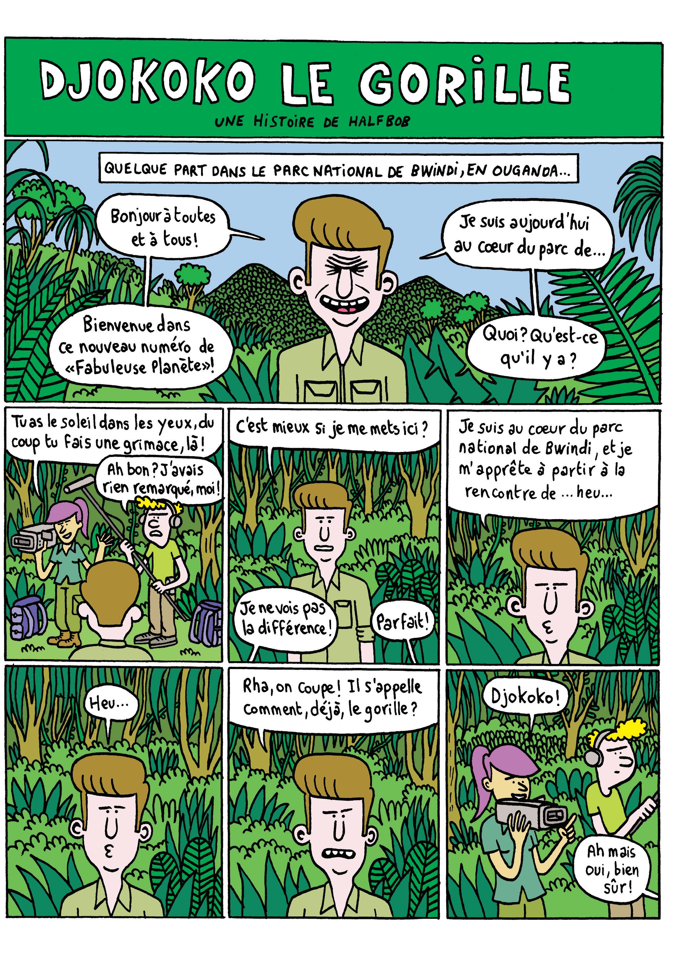 Une grande BD avec une drôle d’équipe de reporters infiltrée dans la forêt tropicale. Un nouvel épisode de Cagoule et Lapin : quand Lapin cueille des gorilles, Cagoule doute...