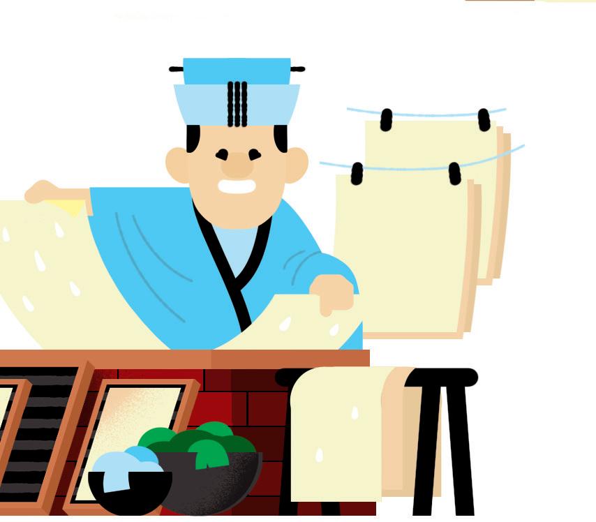 Mon nom est Tsaï Lun et j’ai inventé le papier moderne en mélangeant des plantes, des écorces et des chiffons. Là, je fais sécher les feuilles.
