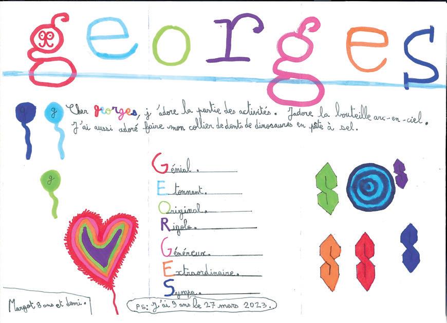 Et pour répondre aux différentes questions : Cléa, il y a malheureusement beaucoup d’espèces menacées, il faudrait demander à une personne spécialiste. Albina, tes questions sont très difficiles... Est-ce que Georges existe ? Dans notre imagination, oui ! Mais il aurait pu effectivement s’appeler Nils, Georgette, Rodrigo ou Rosalie. Maëly, tu verras p. 54 qu’il y a toute une équipe qui a créé Georges !