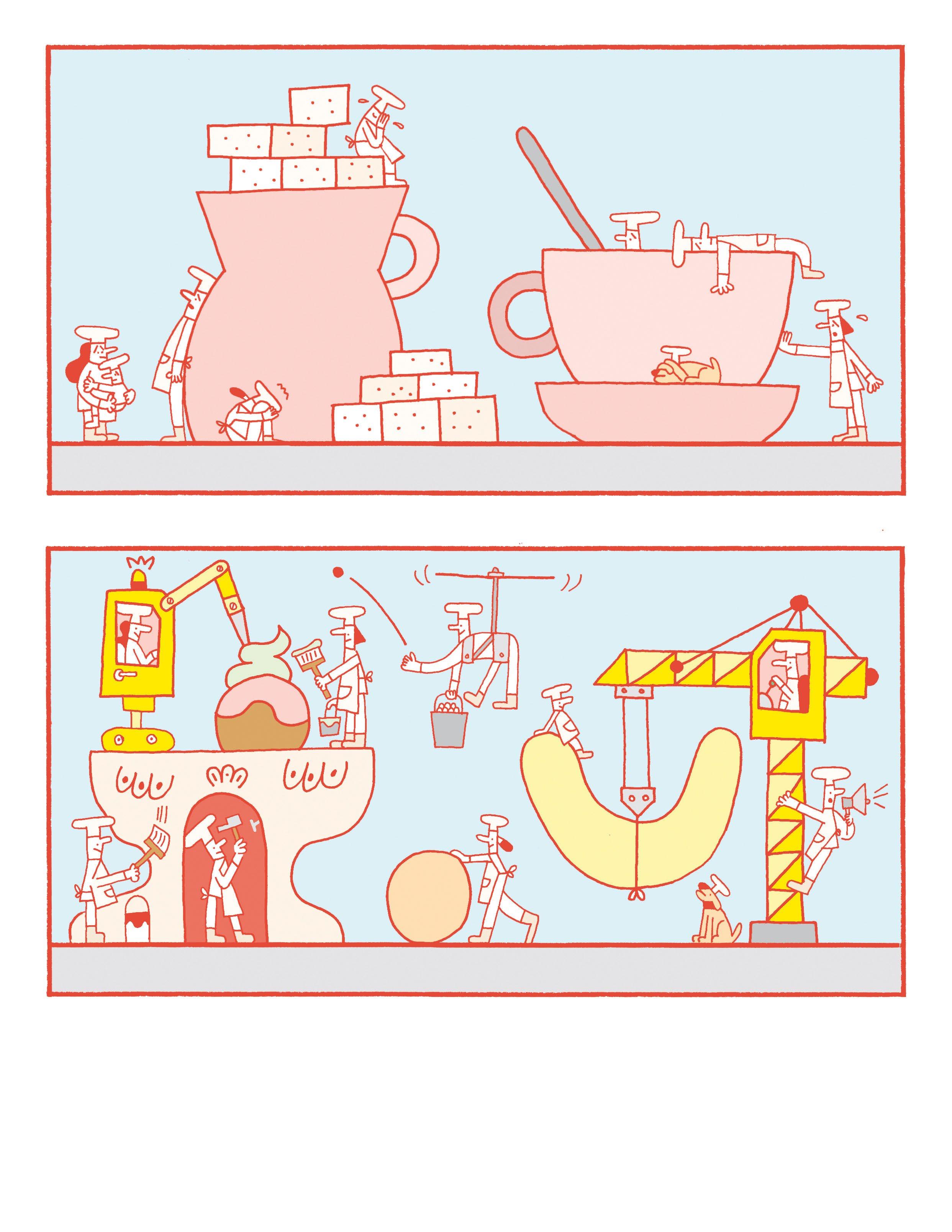 « Voyons les choses en grand ! Il nous faut un palace ! Avec des escaliers en chocolat, des balconnets en nougat et peut-être même une piscine en sirop de grenadine. Allons, du nerf les petits pâtissiers et les petites pâtissières ! » s’exclamèrent les plus énergiques.
