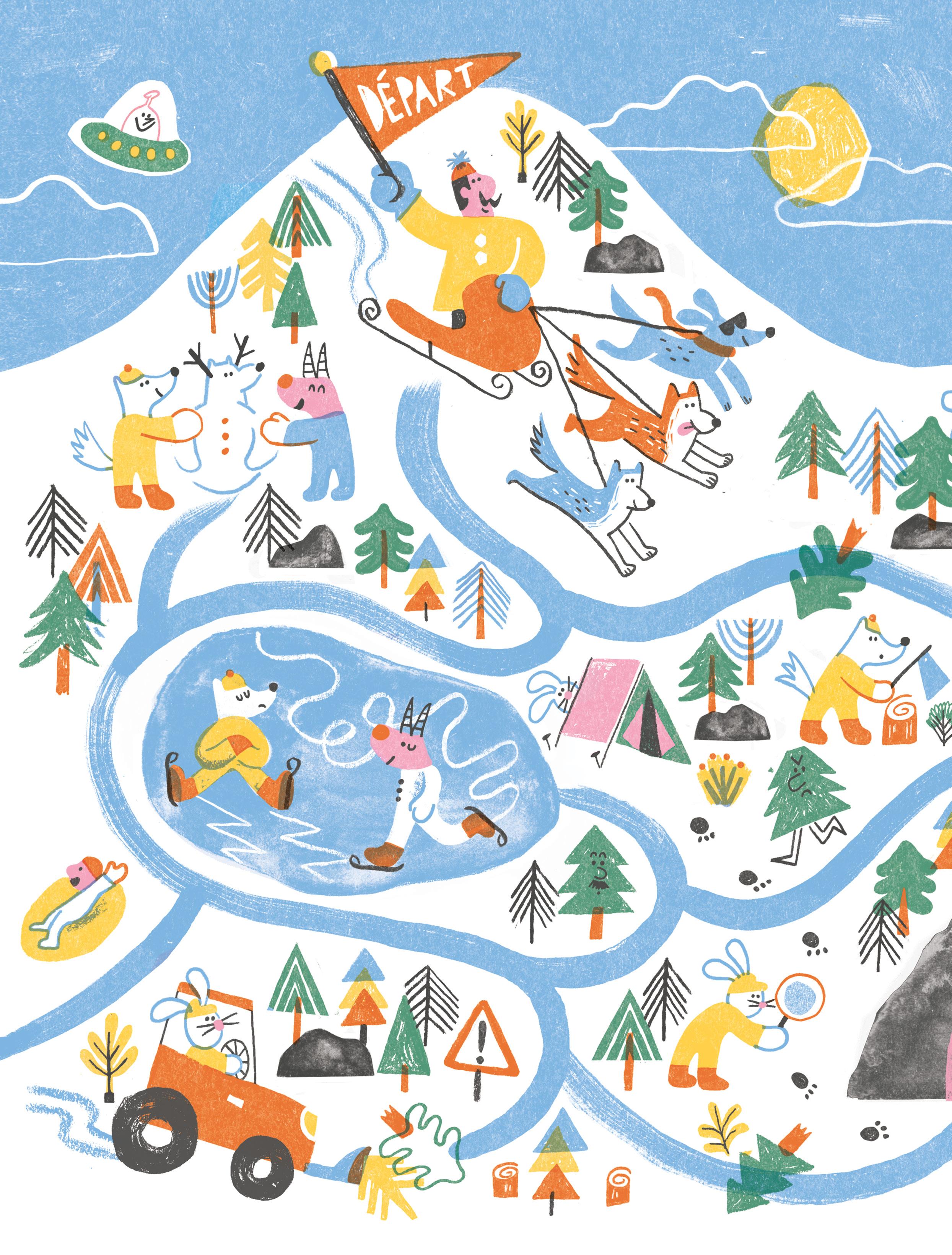 Aide le traîneau à dévaler la piste en évitant les sapins. Puis, retrouve dans l’image 6 lapins, 3 bouquetins et 4 renards polaires.