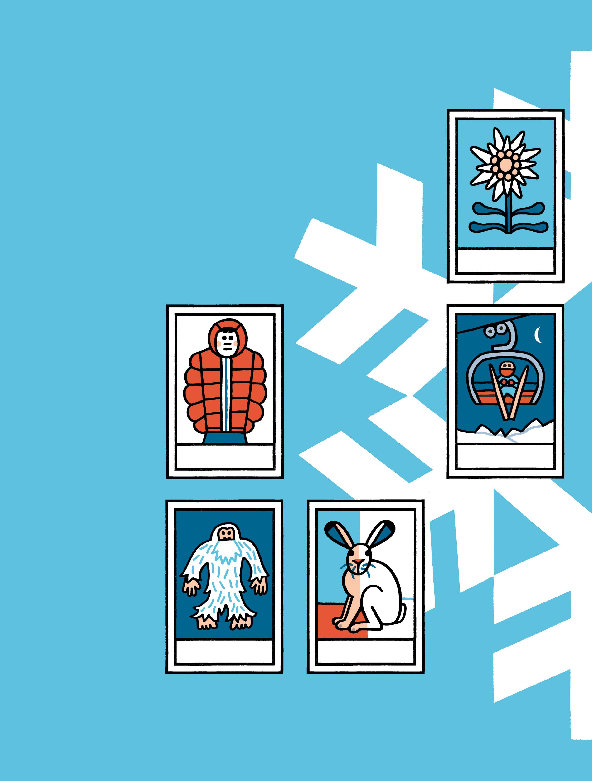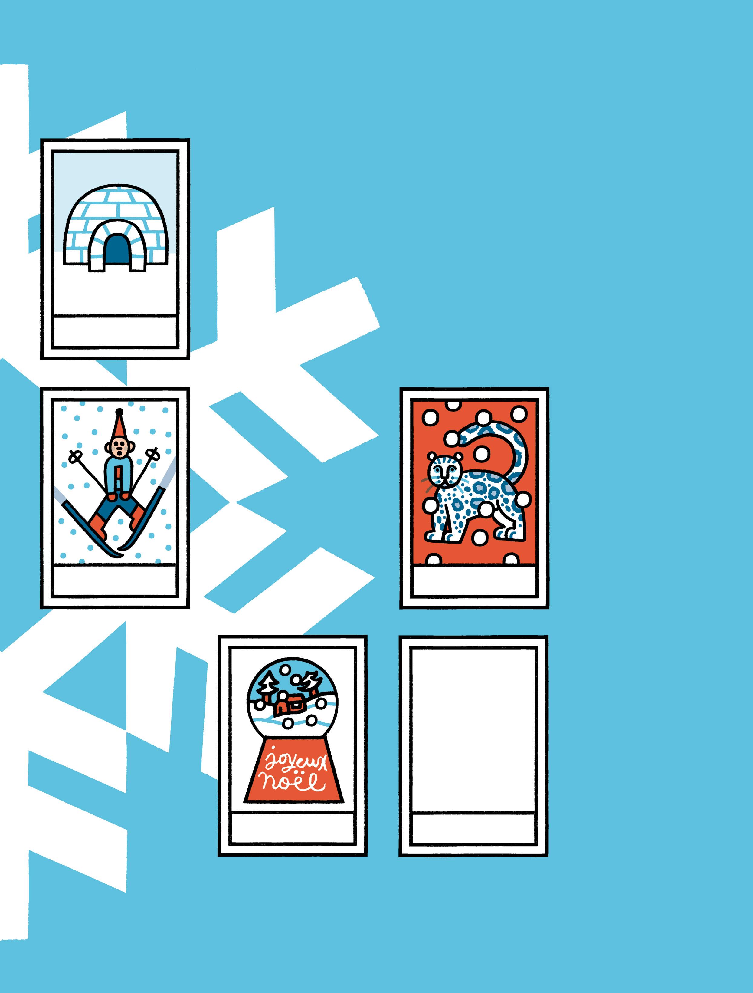 Avec les autocollants, ajoute des traces de raquettes et des empreintes d’animaux dans la neige.