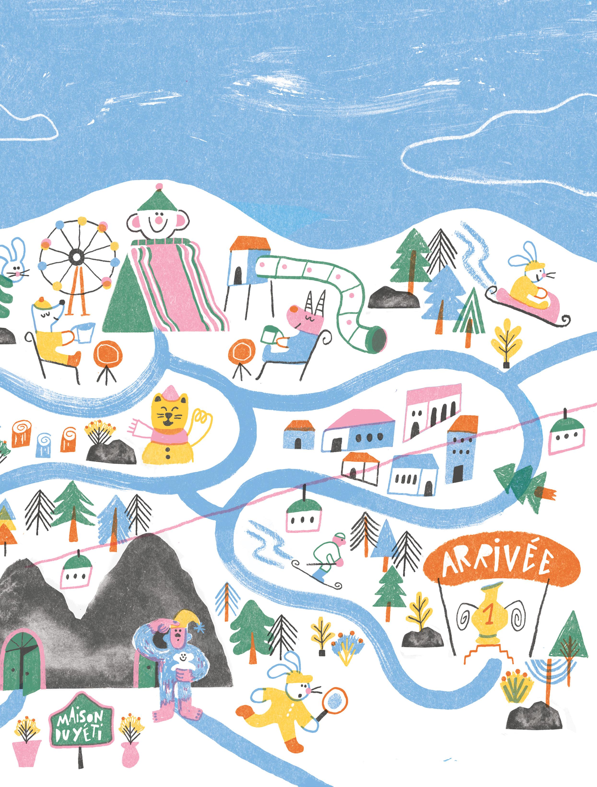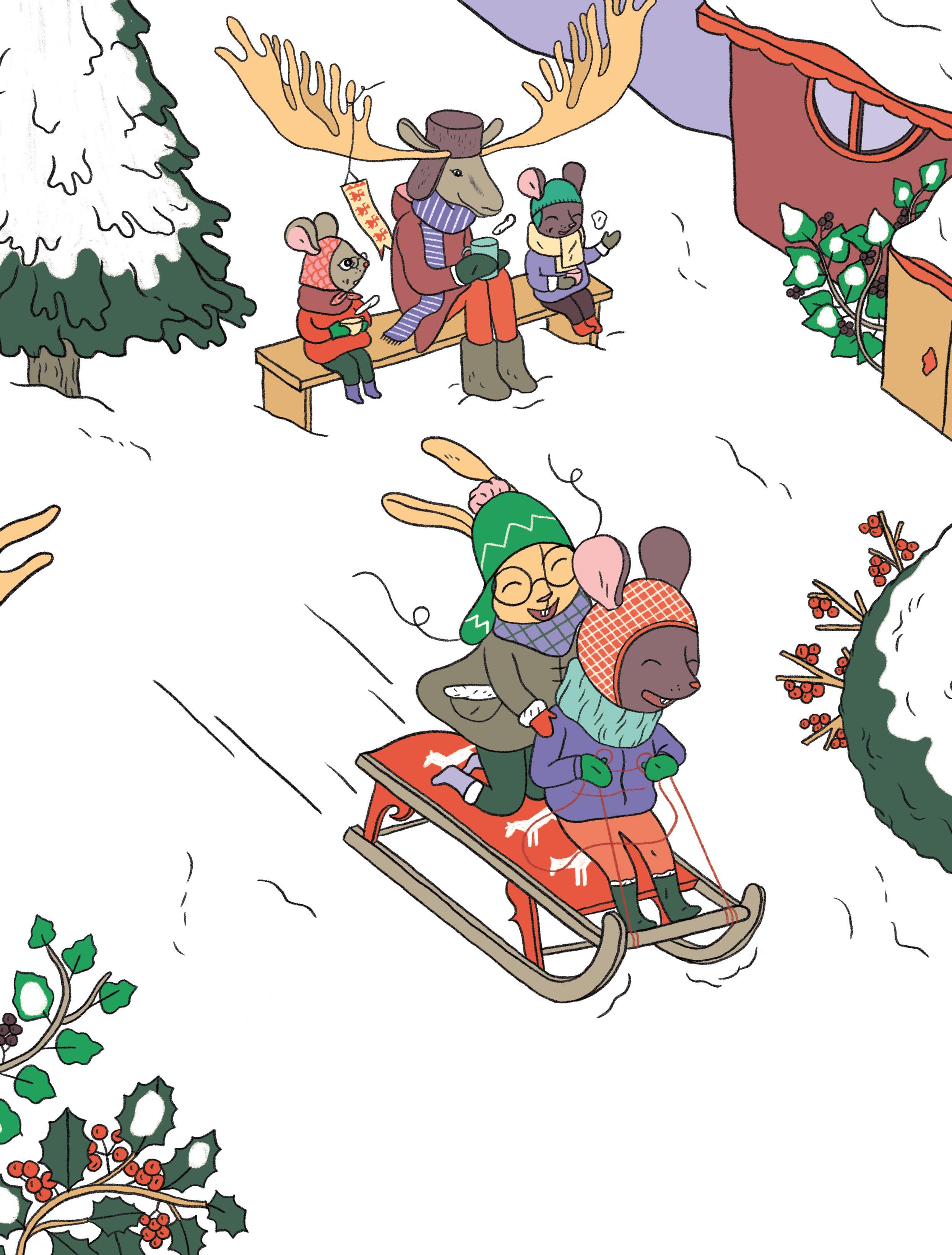 Tout le monde rit beaucoup, Grigri sèche ses larmes et mouche son nez gelé. Que d’émotions ! On se souviendra longtemps de cette histoire – et on rentrera la luge à l’abri ce soir, au cas où. Les deux amis enfourchent vite leur bolide pour dévaler les pentes. Une joyeuse journée dans la neige peut maintenant commencer !