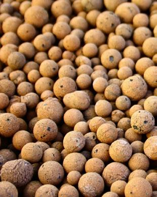 Granulométrie : 0,5-1 cm. L’argile a la capacité de retenir l’humidité en plus de drainer. Les billes d’argile expansées, qui contiennent aussi beaucoup d’air, offrent des conditions idéales pour l’enracinement. On les utilise mélangées au substrat ou parfois pures. Plus généralement, elles servent aussi dans les fonds des pots, à la fois pour assurer un bon drainage et une petite réserve d’eau.