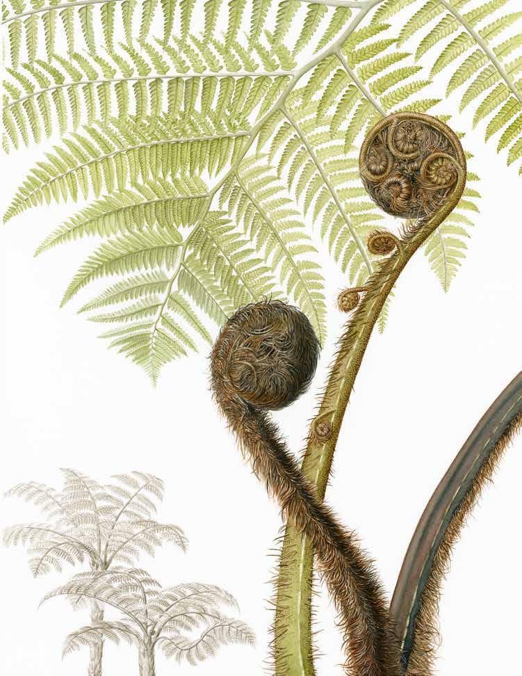 Présente dans les îles du Pacifique Sud, Sphaeropteris medullaris est une splendide fougère arborescente, parmi les plus imposantes au monde, atteignant jusqu’à 20 mètres de hauteur. Dans la mythologie māorie, les enfants de Te Hāpuku, tentant d’échapper à la colère du demi-dieu Tāwhaki, se transformèrent en diverses créatures pour fuir. Dans l’océan, ils devinrent de grands poissons ou des cétacés, tandis qu’en forêt, ils prirent la forme de fougères arborescentes. Mamaku, qui signifie poisson de la forêt en māori, est le nom donné localement à cette espèce remarquable. Tout comme les poissons, le mamaku constitue une source alimentaire précieuse : la moelle centrale de son stipe est tendre et riche en amidon. Georg Forster, naturaliste ayant accompagné le célèbre voyage du capitaine James Cook, décrivit cette fougère comme étant « d’un goût assez agréable, bien que son principal défaut soit de ne pas être suffisamment abondante pour garantir un approvisionnement constant. » Ce caractère singulier pourrait expliquer pourquoi Forster choisit de baptiser l’espèce medullaris, qui signifie « avec de la moelle ».